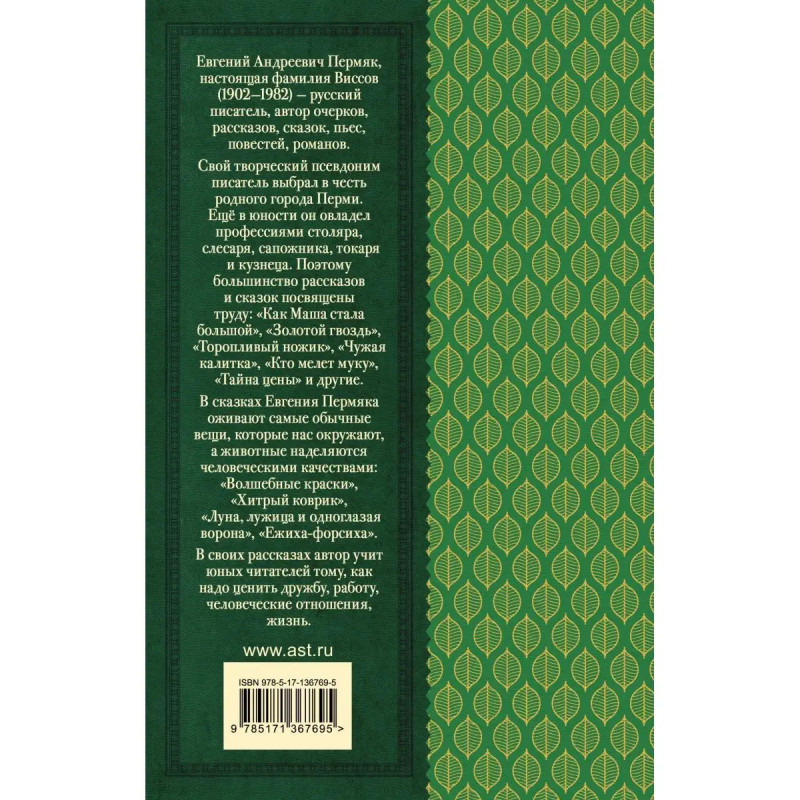 Евгений Андреевич Пермяк, настоящая фамилия Виссов (1921982) русский писатель, автор очерков, рассказов, сказок, пьес, повестей, романов. Свой творческий псевдоним писатель выбрал в честь родного города Перми. Ещё в юности он овладел профессиями столяра, слесаря, сапожника, токаря и кузнеца. Поэтому большинство рассказов и сказок посвящены труду: "Как Маша стала большой", "Золотой гвоздь", "Торопливый ножик", "Чужая калитка", "Кто мелет муку", "Тайна цены" и другие. В сказках Евгения Пермяка оживают самые обычные вещи, которые нас окружают, а животные наделяются человеческими качествами : "Волшебные краски", "Хитрый коврик", "Луна, лужица и одноглазая ворона", "Ежиха-форсиха". В своих рассказах автор учит юных читателей тому, как надо ценить дружбу, работу, человеческие отношения, жизнь. В сборник вошли рассказы и сказки писателя, написанные для детей.