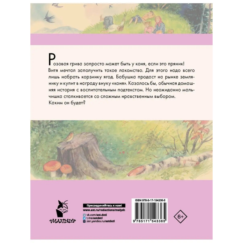 Розовая грива запросто может быть у коня, если это пряник! Витя мечтал заполучить такое лакомство. Для этого надо всего лишь набрать корзинку ягод. Бабушка продаст на рынке землянику и купит в награду внуку коня. Казалось бы, обычная домашняя история с воспитательным подтекстом. Но неожиданно мальчишка сталкивается со сложным нравственным выбором. Каким он будет?