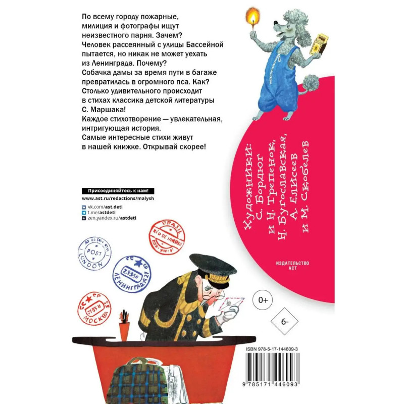 По всему городу пожарные, милиция и фотографы ищут неизвестного парня. Зачем? Человек рассеянный с улицы Бассейной пытается, но никак не может уехать из Ленинграда. Почему? Собачка дамы за время пути в багаже превратилась в огромного пса. Как? Столько удивительного происходит в стихах классика детской литературы С. Маршака! Каждое стихотворение увлекательная, интригующая история. Самые интересные стихи живут в нашей книжке. Открывай скорее!