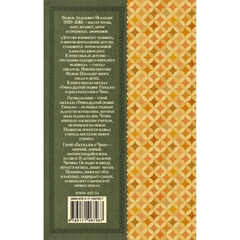 Фазиль Абдулович Искандер (1929216) мастер прозы, поэт, эссеист, автор остроумных афоризмов. "Детство формирует человека, и многие впечатления детства становятся потом основой характера взрослого. В этом смысле детство это основа будущего взрослого человека", считал писатель. Именно поэтому Фазиль Искандер много писал о детях. В книгу вошли рассказ "Тринадцатый подвиг Геракла" и цикл рассказов о Чике. Пятиклассник герой рассказа "Тринадцатый подвиг Геракла" не решил трудную задачу по математике, которая была задана на дом. Чтобы избежать насмешки учителя, он решился на обман. Подвигом трусости назвал учитель поступок своего ученика. Герой "Рассказов о Чике" озорной, добрый, интересующийся всем на свете 11-летний мальчик Чичико. Он ходит в школу, играет в футбол, любит читать Пушкина, помогает тёте и бабушке, защищает слабых, размышляет о жизни и её первых уроках. Чик заводила в компании. Придумывает разные невероятные приключения и выходит из них героем, не задумываясь, бросается на помощь и с