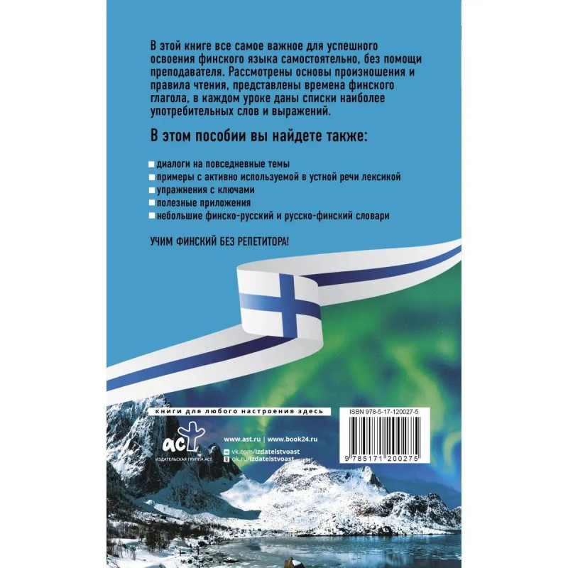 Данный самоучитель поможет читателям самостоятельно без помощи преподавателя овладеть азами финского языка. В этой книге вы найдете правила чтения и произношения, самые нужные грамматические темы, а также узнаете основные финские времена. Материал в пособии изложен максимально понятно и доступно, хорошо запоминается благодаря большому количеству примеров с широкоупотребительной лексикой. Для успешного закрепления пройденной темы даны упражнения с ответами. Вы также можете воспользоваться полезным приложением и финско-русским и русско-финским словарями. Пособие предназначается для широкого круга лиц, изучающих финский язык, и в первую очередь для тех, кто учится самостоятельно.