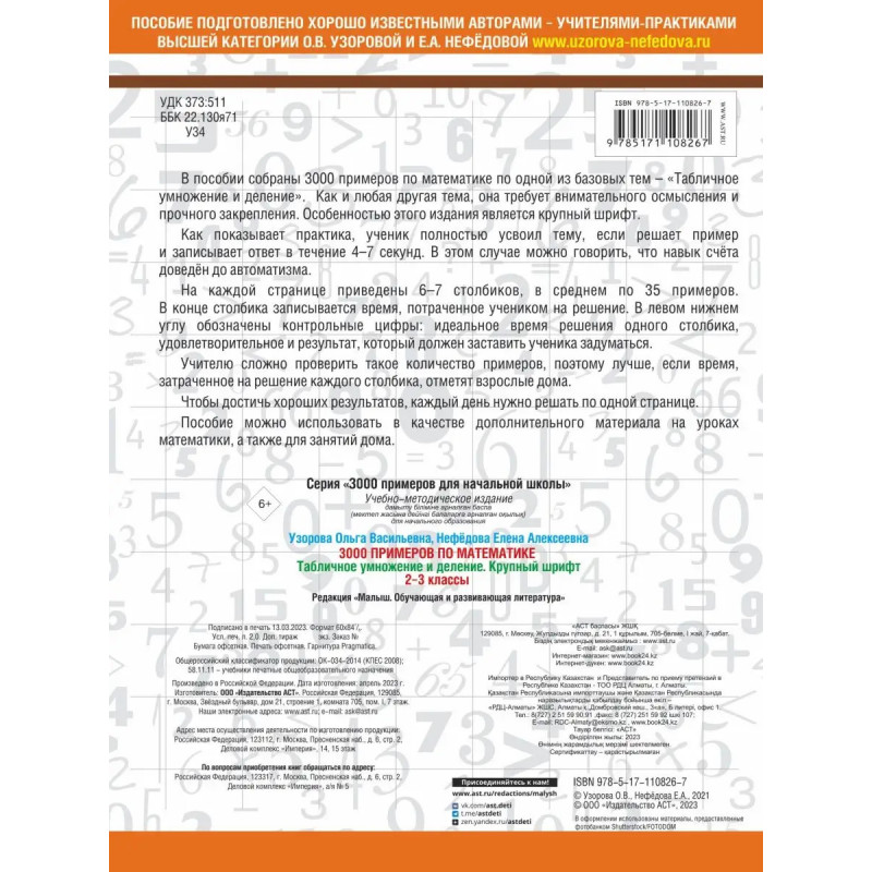 Занимаясь по этой книге, ребенок отлично усвоит тему Табличное умножение и деление, одну из базовых тем, изучаемых в третьем классе, и доведет навык счета до автоматизма. На каждой странице пособия приведены столбики примеров, решив которые ученик записывает время, потраченное на решение. В левом нижнем углу обозначены контрольные цифры: идеальное время решения одного столбика, удовлетворительное и результат, который должен заставить ученика задуматься. Особенностью этого издания является крупный шрифт.Пособие можно использовать в качестве дополнительного материала на уроках математики, а также для самостоятельной работы дома.