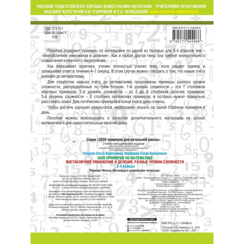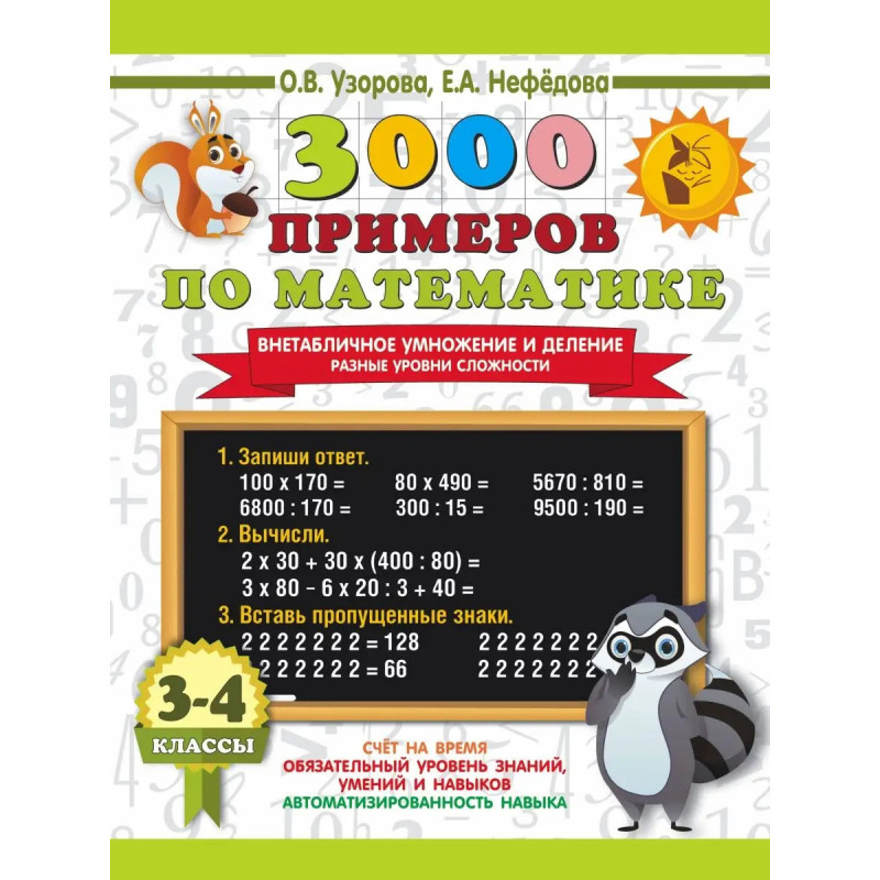 Пособие известных педагогов-практиков, авторов самых издаваемых учебников и учебных пособий в России О.В. Узоровой и Е.А. Нефёдовой содержит примеры по математике по одной из базовых для 3-4 классов тем Внетабличное умножение и деление. Для отработки навыка счёта до автоматизма предложены примеры разного уровня сложности: обычные примеры; цепочки примеров; логические примеры, в которых нужно правильно расставить знаки. Для логических примеров в конце книги даны ответы.Пособие поможет ребенку отработать навык счета до автоматизма.