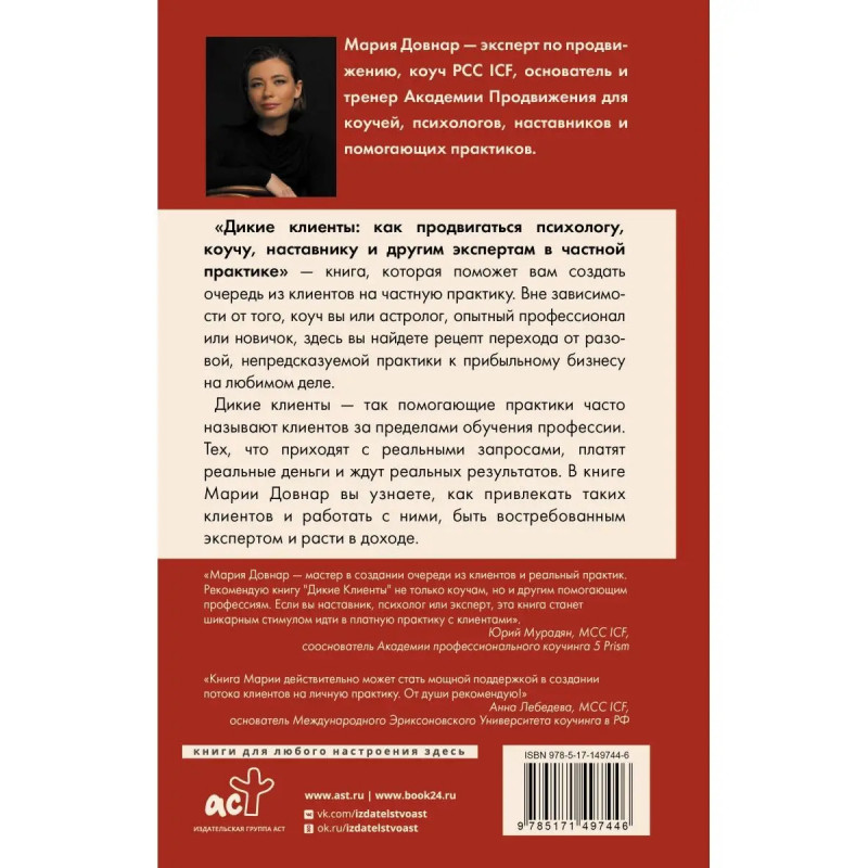 Как пройти путь от нет клиентов даже бесплатных до не беру клиентов: мест нет? Неважно, находитесь вы в процессе обучения профессии или уже давно получили диплом с этой книгой вы сможете быстро перейти от теории к практике, привлечь первых клиентов и получать стабильный доход. Система продвижения Марии Довнар рассчитана по шагам: от выбора ниши, продукта и целевой аудитории до первой встречи с клиентом. Вы узнаете: - Почему делаешь всё как надо, а клиентов нет? - Как назначить цену и не прогадать? - Как побороть синдром самозванца и перестать работать дешево или бесплатно? - Как слить клиента и не заметить? - Что общего между успешными экспертами? Все рекомендации можно внедрять уже по ходу чтения, чтобы к концу книги добиться реальных результатов!