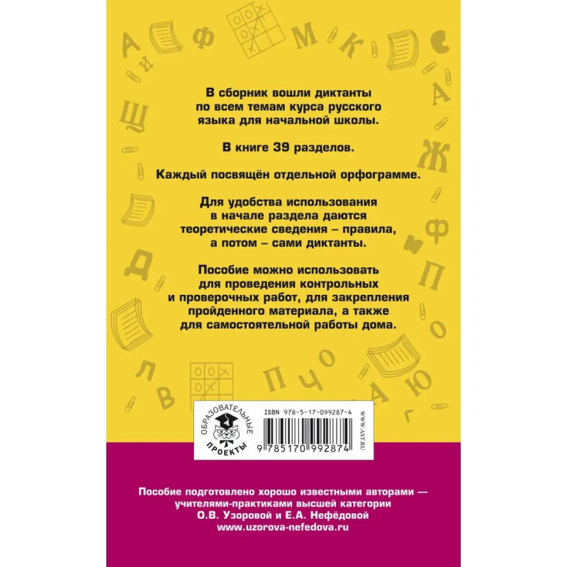 В сборник вошли диктанты по всем темам курса русского языка для начальной школы.Пособие можно использовать для проведения контрольных и проверочных работ, для закрепления пройденного материала, а также для самостоятельной работы дома.В сборник вошли диктанты по всем темам курса русского языка для начальной школы.В книге 39 разделов. Каждый посвящен отдельной орфограмме. Для удобства использования в начале раздела даются теорeтические сведения - правила, а потом - сами диктанты.Пособие можно использовать для проведения контрольных и проверочных работ, для закрепления пройденного материала, а также для самостоятельной работы дома.