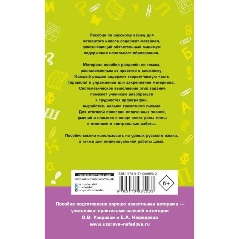 Пособие известных педагогов-практиков, авторов самых издаваемых учебников и учебных пособий в России О.В. Узоровой и Е.А. Нефёдовой содержит материал, охватывающий все темы курса русского языка для 4 класса. В одной книге представлены все необходимые правила и разнообразные упражнения, которые помогут ученику прочно их усвоить и безошибочно применять на практике, а также контрольные и тестовые задания, которые помогут проверить, как усвоен материал.Пособие можно использовать на уроках математики и для самостоятельных занятий дома.
