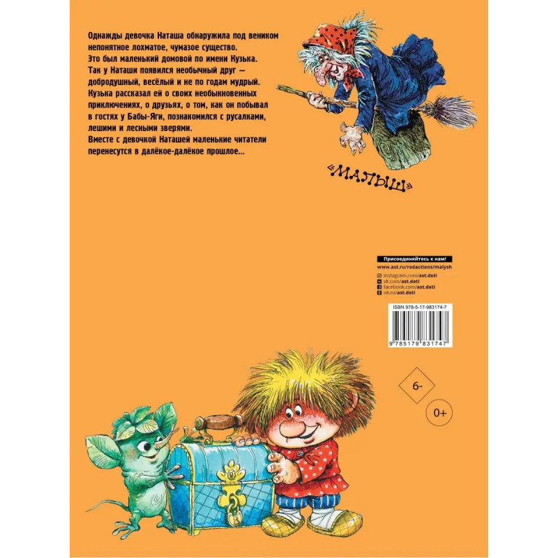 В этой книге "Домовёнок Кузька" известной детской писательницы Татьяны Ивановны Алек- сандровой представлены все три части сказочной повести: "Кузька в новом доме", "Кузька в ле- су" и "Кузька у Бабы-Яги". Т. Александрова создала яркий, обаятельный образ юного домового, который, как умеет, приноравливается к современной жизни. Однажды он знакомится с девочкой Наташей и рассказывает ей свою необыкновенную историю. Читатели оценят красоту и вырази- тельность старых русских слов, прибауток и поговорок, которыми усыпана речь главного героя. Для дошкольного возраста.