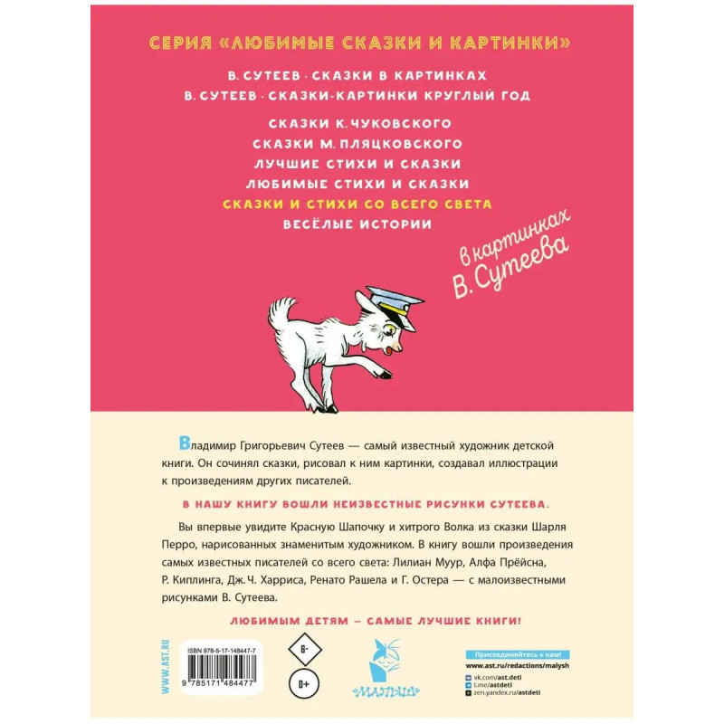 Серия Любимые сказки и картинки посвящена творчеству художника-сказочника, режиссёра-мультипликатора, Заслуженного деятеля искусств РСФСР Владимира Григорьевича Сутеева. На его сказках и картинках выросло несколько поколений читателей. В нашу книгу вошли неизвестные рисунки Сутеева. Вы впервые увидите Красную Шапочку и хитрого Волка из сказки Шарля Перро, нарисованных знаменитым художником. В книгу вошли произведения самых известных писателей со всего света: Лилиан Муур, Альфа Прёйсна, Р. Киплинга, Дж. Ч. Харриса, Ренато Рашела и Г. Остера с малоизвестными рисунками В. Сутеева. Любимым детям самые лучшие книги!