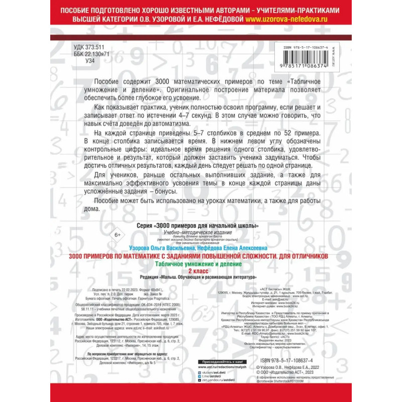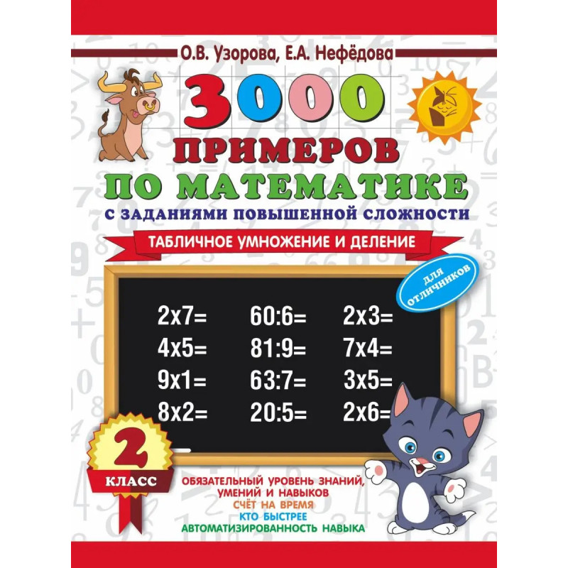 Пособие содержит 3000 математических примеров по теме "Табличное умножение и деление". Оригинальное построение материала позволяет обеспечить более глубокое его усвоение.Как показывает практика, ученик полностью освоил программу, если решает и записывает ответ по истечении 4-7 секунд. В этом случае можно говорить, что навык счёта доведён до автоматизма.На каждой странице приведены 5-7 столбиков в среднем по 52 примера. В конце столбика записывается время. В нижнем левом углу обозначены контрольные цифры: идеальное время решения одного столбика, удовлетворительное и результат, который должен заставить ученика задуматься. Чтобы достичь отличных результатов, каждый день следует решать по одной странице.Для учеников, раньше остальных выполнивших задание, а также для максимально эффективного усвоения темы в конце каждой страницы даны усложненные задания "бонусы".Пособие может быть использовано на уроках математики, а также для работы дома.