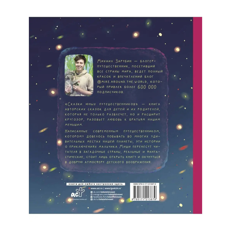 Михаил Зарубин блогер-путешественник, посетивший все страны мира, ведет полный красок и впечатлений блог @mike(точка)around(точка)the(точка)world, который привлек более 6 подписчиков. "Сказки юных путешественников" книга авторских сказок для детей и их родителей, которая не только развлечет, но и расширит кругозор, разовьет любовь к братьям нашим меньшим. Написанные современным путешественником, которому довелось побывать во многих удивительных местах нашей планеты, эти истории о приключениях мальчика Миши перенесут читателя в загадочные страны, реальные и фантастические, стоит лишь открыть книгу и окунуться в добрую атмосферу детского воображения.