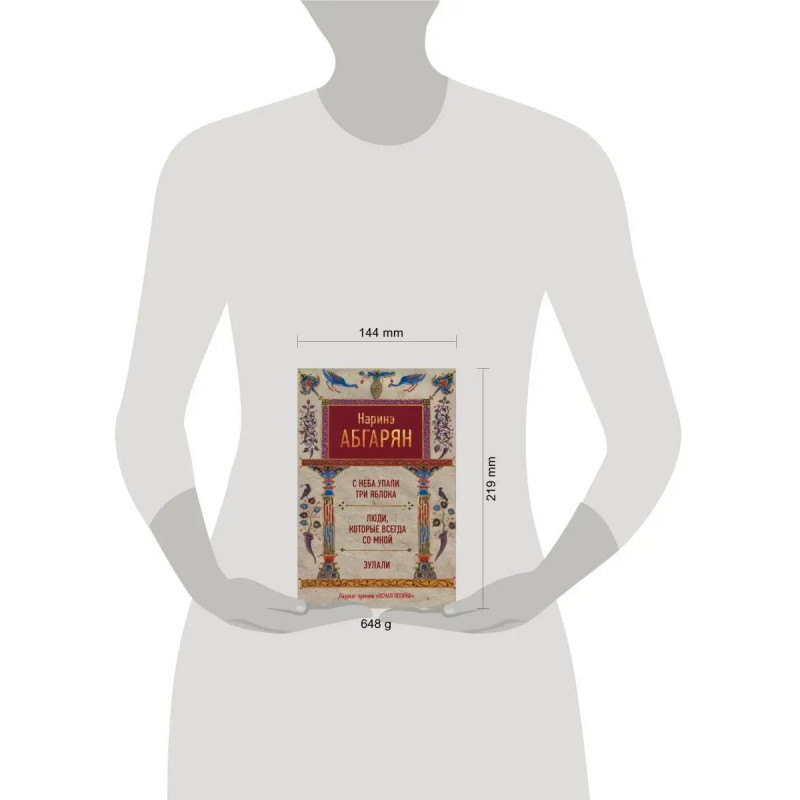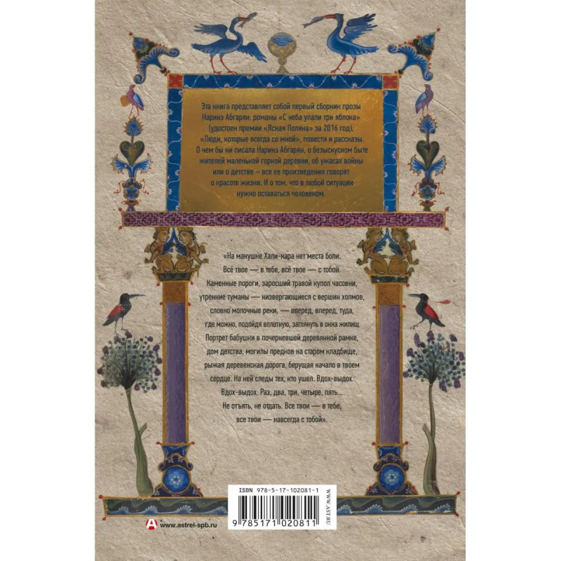 Эта книга представляет собой первый сборник прозы Наринэ Абгарян: романы "С неба упали три яблока" (удостоен премии "Ясная Поляна" за 216 год), "Люди, которые всегда со мной", повести и рассказы. О чем бы ни писала Наринэ Абгарян, о безыскусном быте жителей маленькой горной деревни, об ужасах войны или о детстве все ее произведения говорят о красоте жизни. И о том, что в любой ситуации нужно оставаться человеком. "На макушке Хали-кара нет места боли. Всё твое в тебе, всё твое с тобой. Каменные пороги, заросший травой купол часовни, утренние туманы низвергающиеся с вершин холмов, словно молочные реки, вперед, вперед, туда, где можно, подойдя вплотную, заглянуть в окна жилищ. Портрет бабушки в почерневшей деревянной рамке, дом детства, могилы предков на старом кладбище, рыжая деревенская дорога, берущая начало в твоем сердце. На ней следы тех, кто ушел. Вдох-выдох. Вдох-выдох. Раз, два, три, четыре, пять... Не отъять, не отдать. Все твои в тебе, все твои навсегда с тобой".