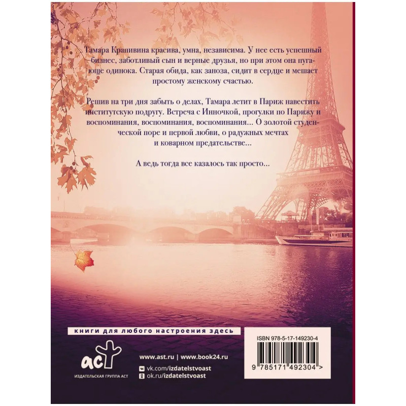 Тамара Крапивина красива, умна, независима. У нее есть успешный бизнес, заботливый сын и верные друзья, но при этом она пугающе одинока. Старая обида, как заноза, сидит в сердце и мешает простому женскому счастью. Решив на три дня забыть о делах, Тамара летит в Париж навестить институтскую подругу. Встреча с Инночкой, прогулки по Парижу и воспоминания, воспоминания, воспоминания О золотой студенческой поре и первой любви, о радужных мечтах и коварном предательстве А ведь тогда все казалось так просто