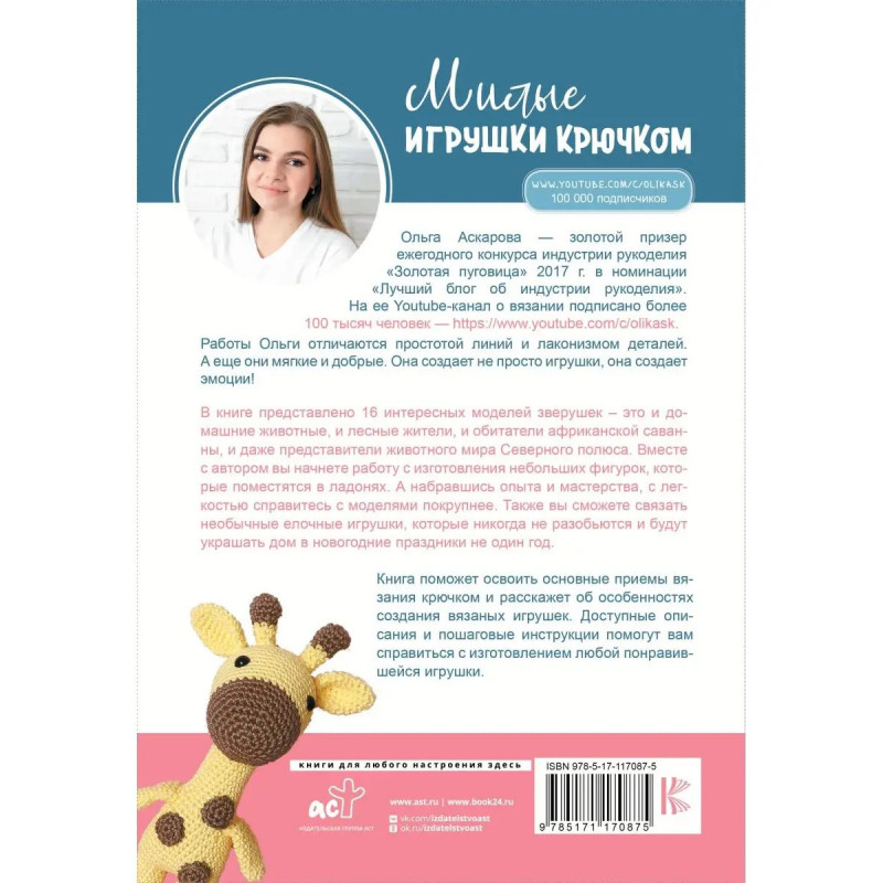 Ольга Аскарова золотой призер ежегодного конкурса индустрии рукоделия "Золотая пуговица" 217 в номинации "Лучший блог об индустрии рукоделия". На ее Youtube-канал о вязании подписано более 1 тысяч человек - https://www(точка)youtube(точка)com/c/olikask. Работы Ольги отличаются простотой линий и лаконизмом деталей. А еще они мягкие и добрые. Она создает не просто игрушки, она создает эмоции! В книге представлено 16 интересных моделей зверушек это и домашние животные, и лесные жители, и обитатели африканской саванны, и даже представители животного мира Северного полюса. Вместе с автором вы начнете работу с изготовления небольших фигурок, которые поместятся в ладонях. А набравшись опыта и мастерства, с легкостью справитесь с моделями покрупнее. Также вы сможете связать необычные елочные игрушки, которые никогда не разобьются и будут украшать дом в новогодние праздники не один год. Книга поможет освоить основные приемы вязания крючком и расскажет об особенностях создания вязаных игрушек. Доступные описания и пошаговые
