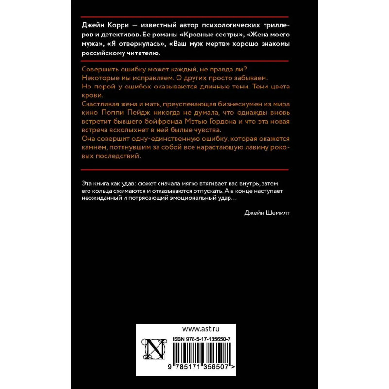 Совершить ошибку может каждый, не правда ли? Некоторые мы исправляем. О других просто забываем. Но порой у ошибок оказываются длинные тени. Тени цвета крови. Счастливая жена и мать, преуспевающая бизнесвумен из мира кино Поппи Пейдж никогда не думала, что однажды вновь встретит бывшего бойфренда Мэтью Гордона и что эта новая встреча всколыхнет в ней былые чувства. Она совершит одну-единственную ошибку, которая окажется камнем, потянувшим за собой все нарастающую лавину роковых последствий.