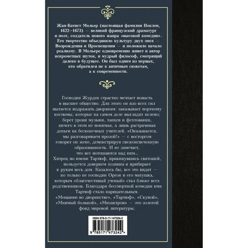 Господин Журден страстно мечтает попасть в высшее общество. Для этого он изо всех сил пытается подражать дворянам: заказывает портному костюмы, которые на самом деле выглядят нелепо; берет уроки музыки, танцев и фехтования, ничего в этом не понимая, а лишь растрачивая деньги на бесконечных учителей. "Оказывается, мы разговариваем прозой!" с восторгом говорит он жене, демонстрируя свежеиспеченную образованность. И не замечает, что все потешаются над ним Хитрец по имени Тартюф, прикинувшись святошей, пользуется доверием хозяина и прибирает к рукам весь дом. Казалось бы, все это видят но только не господин Оргон и его матушка, которым "благочестивый ученый" стал ближе всех родственников. Благодаря бессмертной комедии имя Тартюф стало нарицательным. "Мещанин во дворянстве", "Тартюф", "Скупой", "Мнимый больной", "Мизантроп" - это золотой фонд мировой литературы.
