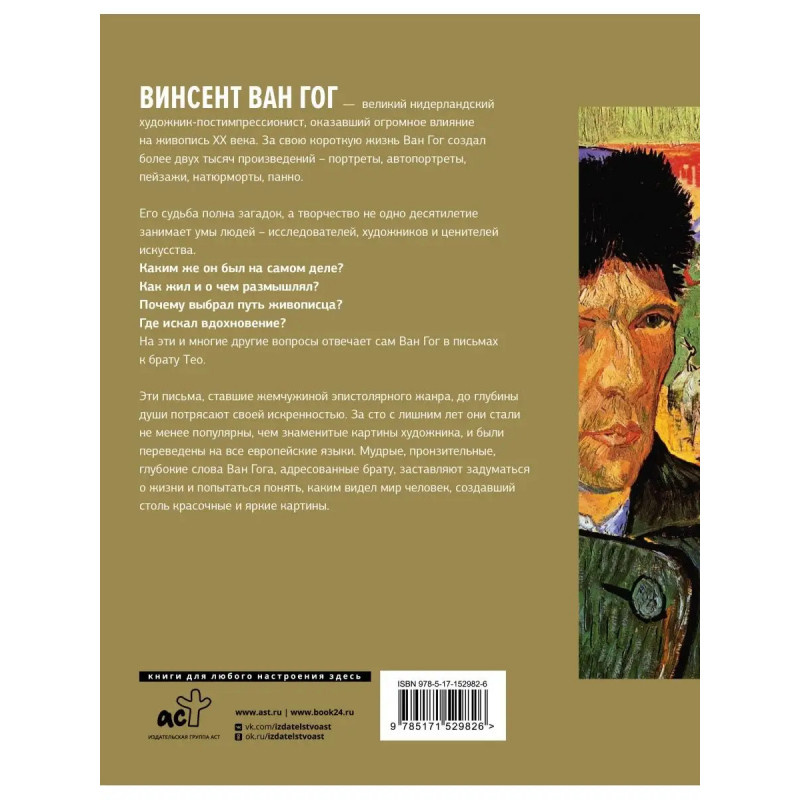 Винсент Ван Гог великий нидерландский художник-постимпрессионист, оказавший огромное влияние на живопись ХХ века. За свою короткую жизнь Ван Гог создал более двух тысяч произведений портреты, автопортреты, пейзажи, натюрморты, панно. Его судьба полна загадок, а творчество не одно десятилетие занимает умы людей исследователей, художников и ценителей искусства. Каким же он был на самом деле? Как жил и о чем размышлял? Почему выбрал путь живописца? Где искал вдохновение? На эти и многие другие вопросы отвечает сам Ван Гог в письмах к брату Тео. Эти письма, ставшие жемчужиной эпистолярного жанра, до глубины души потрясают своей искренностью. За сто с лишним лет они стали не менее популярны, чем знаменитые картины художника, и были перведены на все европейские языки. Мудрые, пронзительные, глубокие слова Ван Гога, адресованные брату, заставляют задуматься о жизни и попытаться понять, каким видел мир человек, создавший столь красочные и яркие картины.