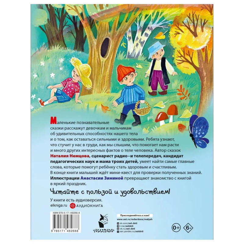5 причин купить книгу: - полезные и увлекательные сказки, которые расскажут малышам об удивительных способностях нашего тела, - познавательные подсказки для расширения кругозора, - автор книги популярный сценарист радио и телепередач, кандидат педагогических наук, многодетная мама, - яркие и добрые иллюстрации, - игровое задание для проверки полученных при помощи сказок знаний.