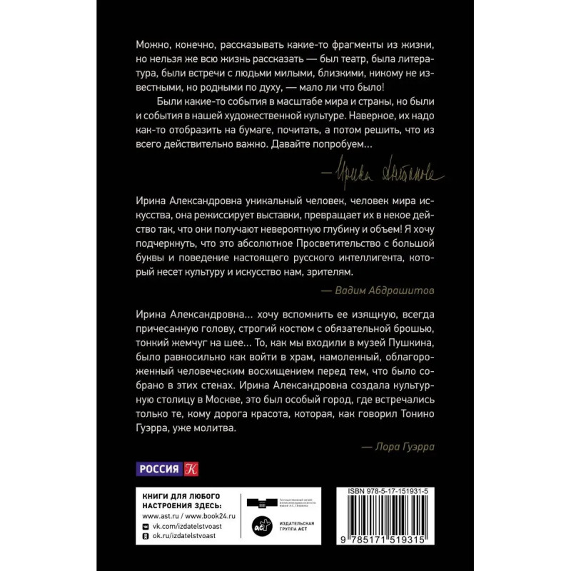 Об искусстве и жизни. Разговоры между делом книга, благодаря которой вы сможете ближе познакомиться с многогранной личностью легендарной хранительницы Пушкинского музея и ее самобытным мировоззрением. Сборник откровенных интервью вдохновит вас на изучение искусства, напомнит о важности умения наслаждаться красотой и отдаваться своему делу без остатка.