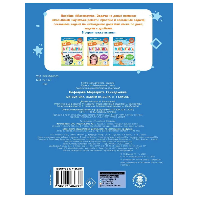 Пособие "Математика. Задачи на доли" поможет учащимся 34 классов поэтапно освоить решение основных видов задач на доли. Работа со схемами в пособии позволит детям более эффективно освоить решение задач на доли и дроби и научиться: разным способам решения составных задач на нахождение доли или числа по доле; решению простых и составных задач; решению задач с дробями. Пособие можно использовать в школе на уроках математики, а также дома для повторения и закрепления пройденного материала.