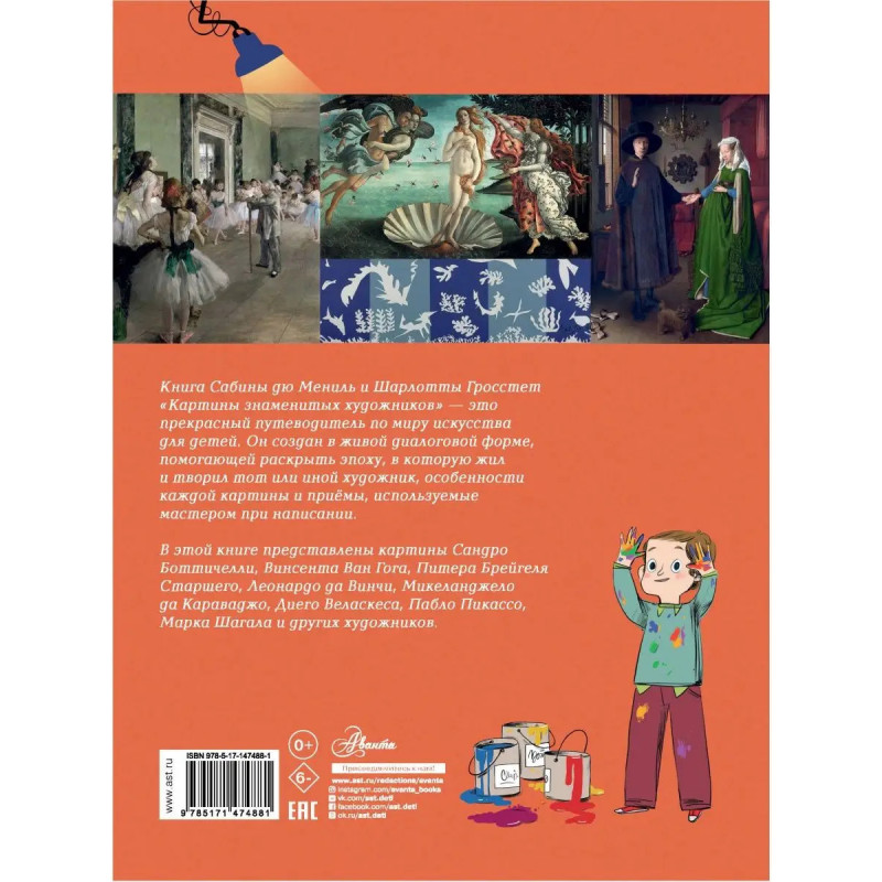 Книга Сабины дю Мениль и Шарлотты Гросстет "Картины знаменитых художников" это прекрасный путеводитель по миру искусства для детей. Он создан в живой диалоговой форме, помогающей раскрыть эпоху, в которую жил и творил тот или иной художник, и особенности каждой картины. Этот путеводитель увлекательно и просто расскажет о судьбах художников и их знаменитых картин, о художественных техниках сфумато, кьяроскуро и других, о скрытых в картинах образах и приёмах, которые применялись художниками впервые. Для младшего школьного возраста.