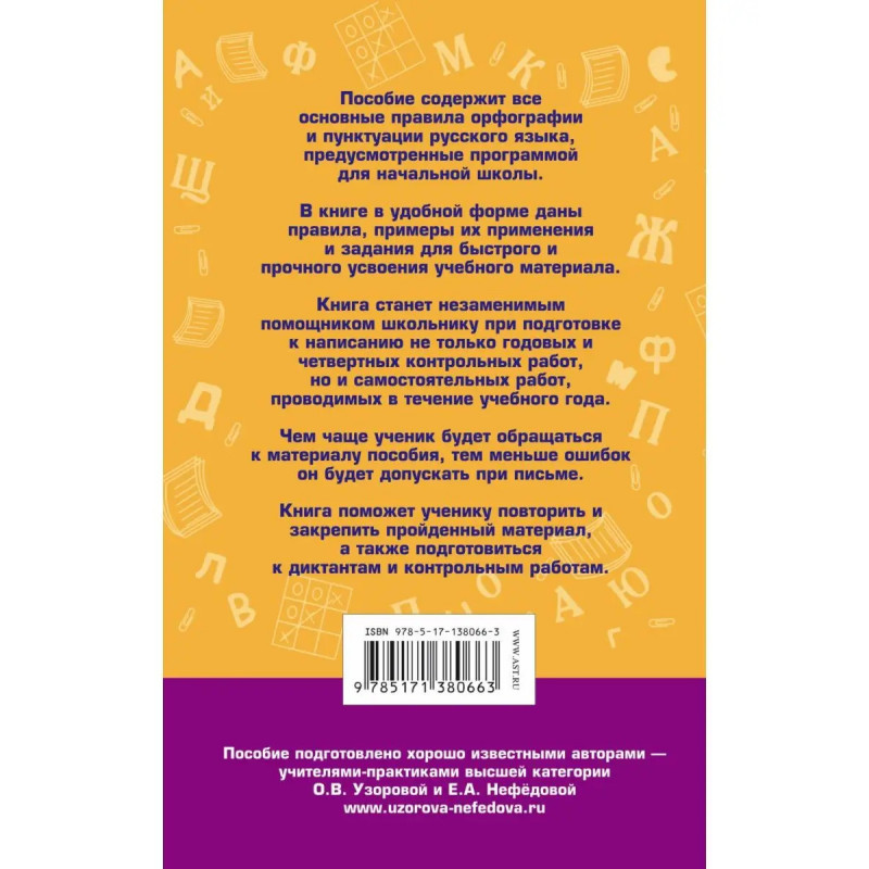 Пособие содержит все основные правила орфографии и пунктуации русского языка, предусмотренные программой начальной школы.В книге в удобной форме даны правила, примеры их применения и задания для быстрого и прочного усвоения учебного материала.Книга поможет ученику повторить и закрепить пройденный материал, а также подготовиться к диктантам и контрольным работам.