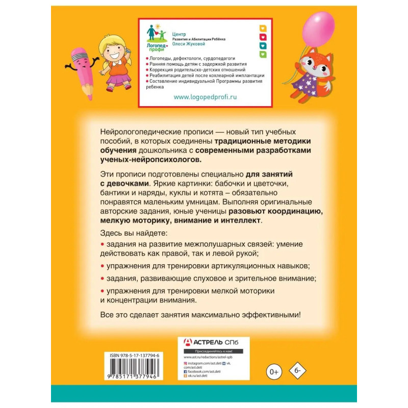 Нейрологопедические прописи новый тип учебных пособий, в которых традиционные методики обучения соединены с современными практическими разработками ведущих российских ученых-нейропсихологов. Эти прописи подготовлены специально для занятий с девочками. Яркие картинки: бабочки и цветочки, бантики и наряды, куклы и котята обязательно понравятся маленьким умницам. Выполняя оригинальные авторские задания, юные ученицы разовьют координацию, мелкую моторику, внимание и интеллект. Для дошкольного возраста.