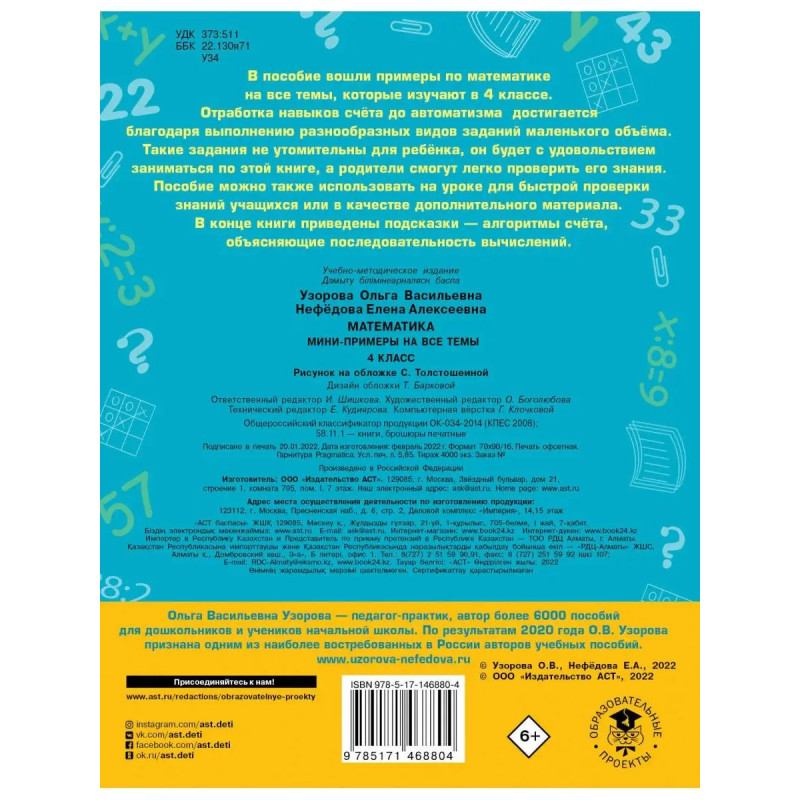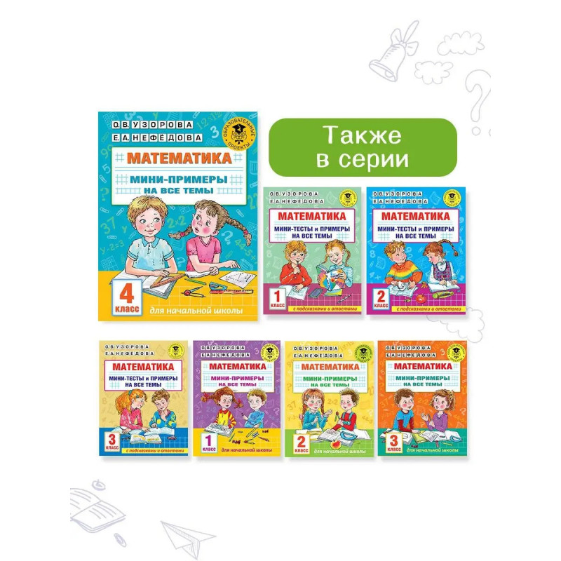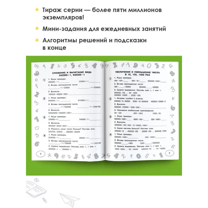 В пособие вошли примеры по математике на все темы, которые изучают в 4 классе. Отработка навыков счёта до автоматизма достигается благодаря выполнению разнообразных видов заданий. В конце книги приведены подсказки алгоритмы счёта, объясняющие последовательность вычислений.Маленький объем заданий не утомителен для ребёнка, и он будет с удовольствием заниматься по этой книге, а родители смогут легко проверить его знания. Такие задания также удобно использовать на уроке для мини-контрольной или в качестве дополнительного материала.Книга пригодится на уроках математики, для работы дома с родителями и станет незаменимым помощником для репетиторов.