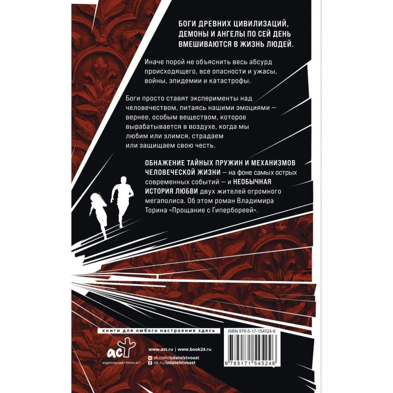Боги древних цивилизаций, демоны и ангелы по сей день вмешиваются в жизнь людей. Иначе порой не объяснить весь абсурд происходящего, все опасности и ужасы, войны, эпидемии и катастрофы. Боги просто ставят эксперименты над человечеством, питаясь нашими эмоциями вернее, особым веществом, которое вырабатывается в воздухе, когда мы любим или злимся, страдаем или защищаем свою честь. Обнажение тайных пружин и механизмов человеческой жизни на фоне самых острых современных событий и необычная история любви двух жителей огромного мегаполиса. Об этом роман Владимира Торина Прощание с Гипербореей.