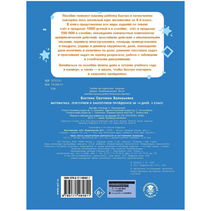 Пособие "Математика. Повторяем и закрепляем пройденное за 14 дней. 4 класс" поможет вашему школьнику быстро и качественно повторить весь школьный курс математики за 4-й класс. В книге представлены все виды заданий по темам: счёт в пределах 1 устный и в столбик; счёт в пределах 1 в столбик; нахождение неизвестных компонентов арифметических действий; простейшие действия с именованными числами; периметр многоугольника, площадь прямоугольника и квадрата, радиус и диаметр окружности; доли, нахождение доли величины и величины по доле; решение текстовых задач и простейших задач на оценку результата; работа с таблицами и столбчатыми диаграммами. Занятия по пособию могут быть организованы дома и в школе в конце текущего, в начале следующего учебного года, а также в период летних каникул.