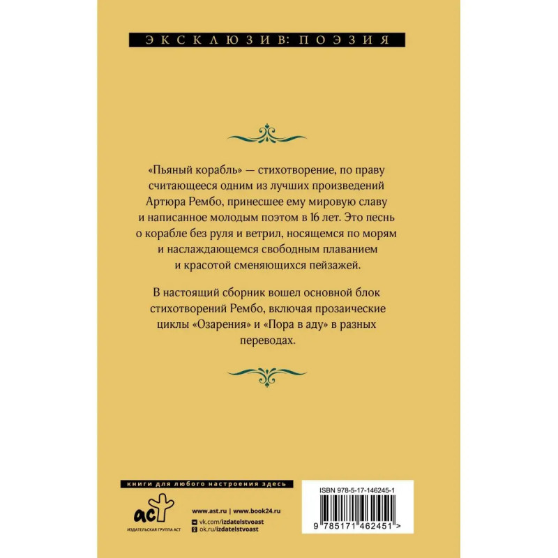 Артюр Рембо (1854 1891) французский поэт, друг Поля Верлена, участник восстания Парижской коммуны, про которого Виктор Гюго говорил: "Это Шекспир-дитя". Рембо писал всего четыре года из прожитых на свете 37, но за это недолгое время поэт создал удивительные стихи воплощение свободы и бунтарства. "Пьяный корабль" стихотворение, по праву считающееся одним из лучших произведений Артюра Рембо, принесшее ему мировую славу и написанное молодым поэтом в 16 лет. Это песнь о корабле без руля и ветрил, носящемся по морям и наслаждающемся свободным плаванием и красотой сменяющихся пейзажей. В настоящий сборник вошел основной блок стихотворений Рембо, включая прозаические циклы "Озарения" и "Пора в аду" в разных переводах.