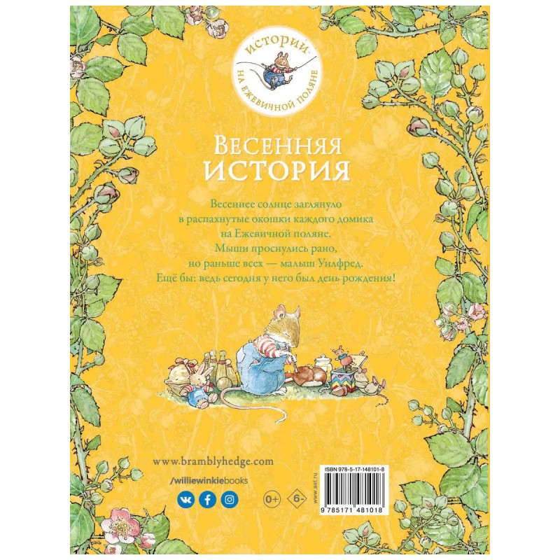 Ах, какое прекрасное это было утро! Весеннее солнце заглянуло в распахнутые окошки каждого домика на Ежевичной поляне. Мыши проснулись рано, но раньше всех малыш Уилфред. Ещё бы: ведь сегодня у него был день рождения! Впервые сказки про приключения мышат увидели свет в 198 году и принесли автору и иллюстратору Джилл Барклем мировую известность. Больше 7 читателей обожают жителей ежевичной поляны. Внимание даже к самыми крохотным деталям, добрые сюжеты и уютная британская атмосфера в мире Джилл Барклем так хочется задержаться хотя бы на ещё одну чашку ароматного чая! Книга выходит в блистательном переводе Ольги Мяэотс.