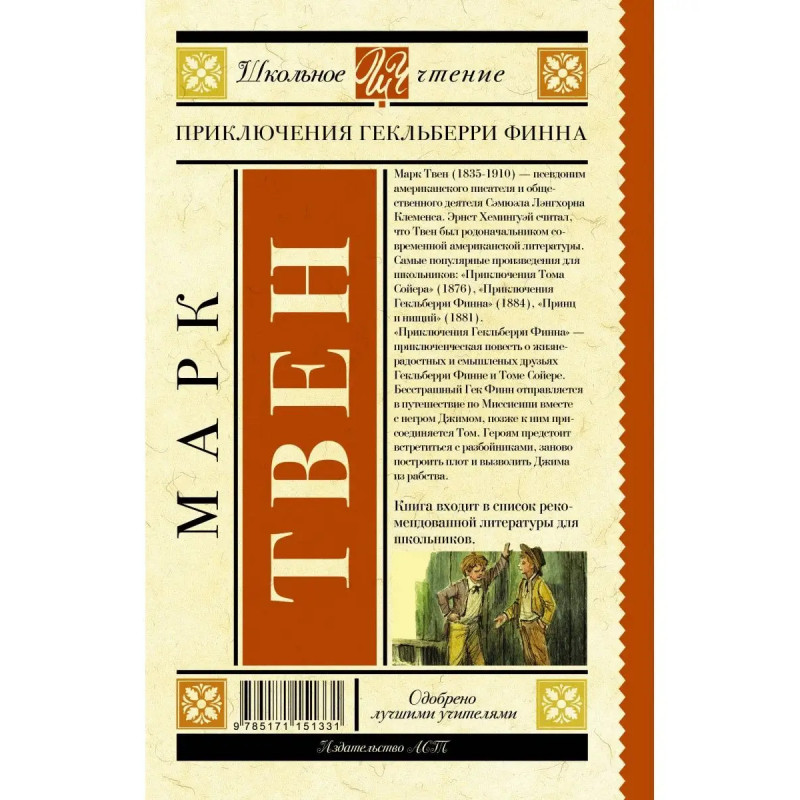Марк Твен (1835-191) псевдоним американского писателя и общественного деятеля Сэмюэла Лэнгхорна Клеменса. Эрнст Хемингуэй считал, что Твен был родоначальником современной американской литературы. Самые популярные произведения для школьников: "Приключения Тома Сойера" (1876), "Приключения Гекльберри Финна" (1884), "Принц и нищий" (1881). "Приключения Гекльберри Финна" приключенческая повесть о жизнерадостных и смышленых друзьях Гекльберри Финне и Томе Сойере. Бесстрашный Гек Финн отправляется в путешествие по Миссисипи вместе с негром Джимом, позже к ним присоединяется Том. Героям предстоит встретиться с разбойниками, заново построить плот и вызволить Джима из рабства. Книга входит в список рекомендованной литературы для школьников.