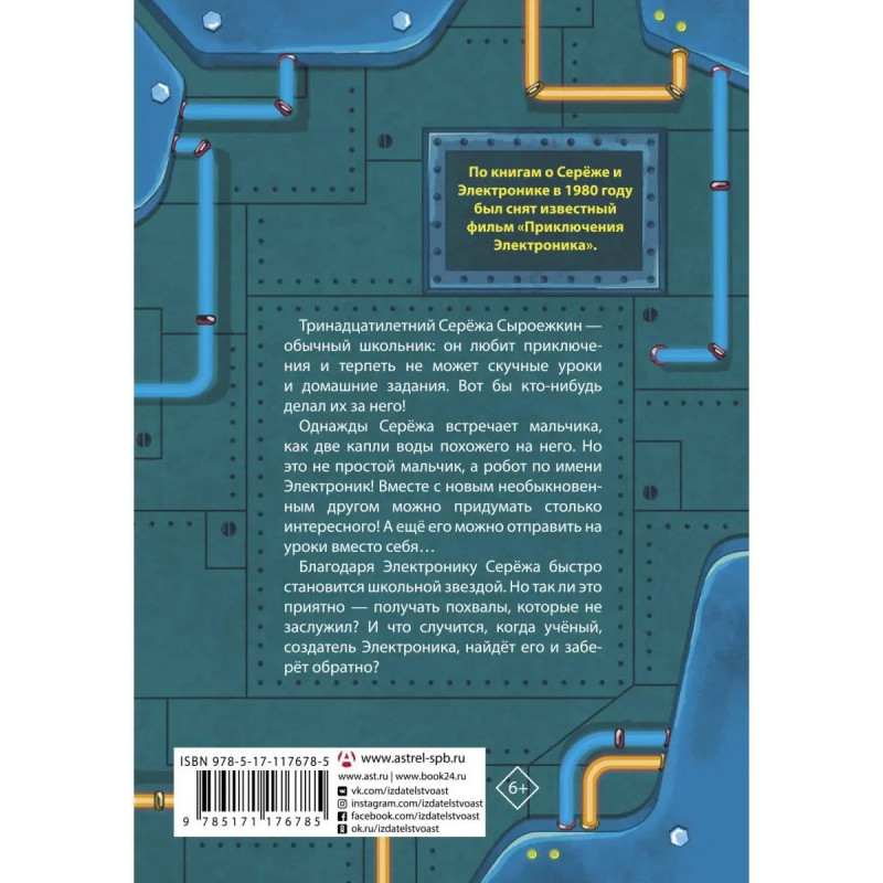 Евгений Велтистов (19341989) один из первых отечественных детских писателей-фантастов. Самое его известное произведение цикл повестей про мальчика-робота Электроника, как две капли воды похожего на Серёжу Сыроежкина, ученика седьмого класса. Первая повесть в оригинале называется "Электроник мальчик из чемодана" (в нашем издании "Приключения Электроника"), за ней следуют несколько продолжений. Обнаружив, какими талантами обладает Электроник, Сыроежкин с удивительной беспечностью отправляет робота в свою школу и безмерно радуется удаче. Однако очень скоро становится ясно, вопервых, что сохранить эту тайну не удастся, ведь Электроник фантастически одарён во всех областях. А во-вторых, как же скучно ничего не делать и ничему не учиться!