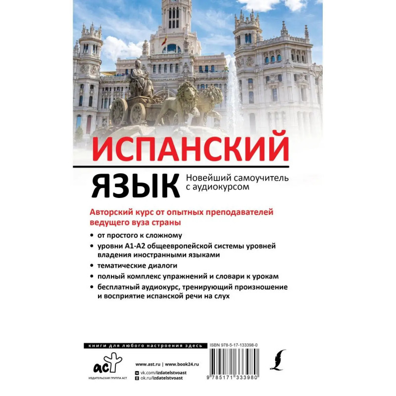 Данный учебник предназначен для всех, кто желает изучать испанский язык и интересуется культурой испаноязычных стран. Курс построен по принципу от простого к сложному и включает 15 уроков. Каждый урок содержит объяснения основных тем базовой грамматики с упражнениями, а также лексический материал и разговорную практику: тематический словарь, тексты и диалоги, упражнения для закрепления материала. Многие диалоги, тексты и упражнения, озвученные носителями языка, совершенно бесплатно доступны для прослушивания на официальном сайте издательства АСТ в разделе "Аудио". В приложение вынесены таблицы спряжения отклоняющихся и неправильных глаголов, список порядковых числительных и другие полезные материалы. В этом пособии вы найдете необходимый объем испанской грамматики и лексики, соответствующий уровням А1-А2 языковой компетенции общеевропейской системы уровней владения иностранным языком. Книга может быть использована как на занятиях в языковых и неязыковых вузах, школах, гимназиях, на языковых курсах, так и для