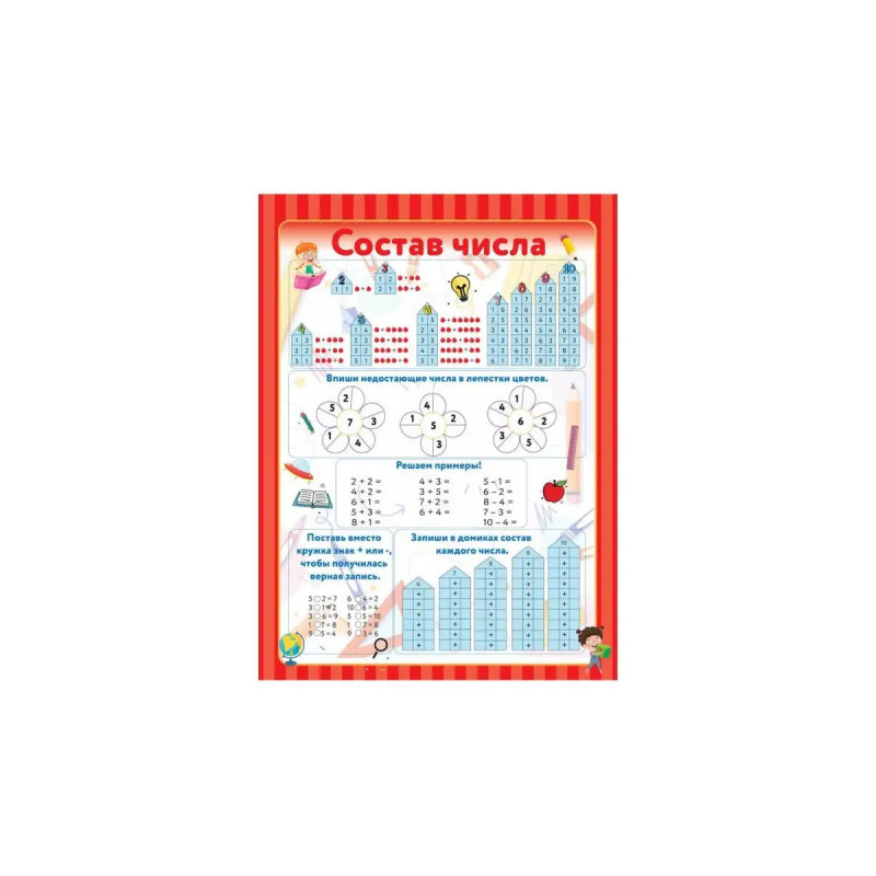 В этой удивительной папке 1 ярких плакатов обо всём, что должен знать маленький отличник в начальной школе. Плакаты легко достать и легко хранить: они не помнутся и не займут много места каждый складывается и убирается в компактную папку. Просто сложи и убери! Повесьте любимые плакаты на стену детской, чтобы настроить ребёнка на учёбу и заниматься в любое удобное время! Размер одного плаката 7 х 5 см. Этот набор будет служить вам не один год! С его помощью ваш ребёнок легко запомнит алфавит, звуки и буквы, научится считать и совершать арифметические действия, запомнит состав числа и таблицу умножения, будет правильно употреблять падежи, определять части речи и члены предложения, разбирать слова по составу и писать грамотно! Все базовые темы в одном наборе! Всё, что нужно ученику начальной школы, под одной обложкой! Все базовые темы: Алфавит, Азбука; Звуки И Буквы; Цифры и счёт; Таблица умножения; Состав числа; Арифметика, арифметические действия, сложение, вычитание, умножение, деление; Единицы измер