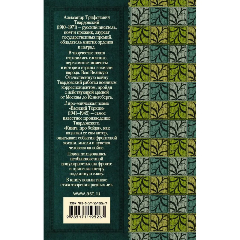Александр Трифонович Твардовский (1911971) русский писатель, поэт и прозаик, лауреат государственных премий, обладатель многих орденов и наград. В творчестве поэта отразились сложные, переломные моменты в истории страны и жизни народа. Всю Великую Отечественную войну Твардовский работал военным корреспондентом, пройдя с действующей армией от Москвы до Кенигсберга. Лиро-эпическая поэма Василий Тёркин (1941-1945) самое известное произведение Твардовского. Книга про бойца, как называл ее сам автор, описывает события фронтовой жизни, мысли и чувства человека на войне. Поэма пользовалась необыкновенной популярностью на фронте и принесла автору подлинную славу. В книгу вошли также стихотворения разных лет.
