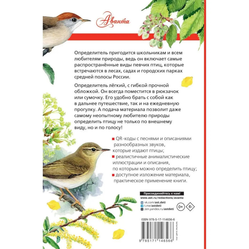 Определитель "Певчие птицы средней полосы европейской части России с голосами птиц", написанный орнитологами Евгением Кобликом и Владимиром Архиповым, поможет юным и взрослым любителям природы научиться определять птиц в природе, расскажет, по каким признакам можно отличать птиц в полёте, самцов, самок и молодых птиц одного вида, представит примеры их облика на анималистических рисунках и фотографиях. Оописания песен и звуков дополнят QR-коды, с помощью которых можно услышать "живые" голоса птиц. Краткая аннотация Определитель "Певчие птицы России с голосами птиц", созданный орнитологом, кандидатом биологических наук Евгением Кобликом и орнитологом-акустиком Владимиром Архиповым, научит различать певчих птиц средней полосы нашей страны, не только по внешнему виду, но и по голосам - песням и позывкам. 4-я сторонка обложки Определитель пригодится школьникам и всем любителям природы, ведь он включает самые распространённые виды певчих птиц, которые встречаются в лесах, садах и городских парках средней полосы