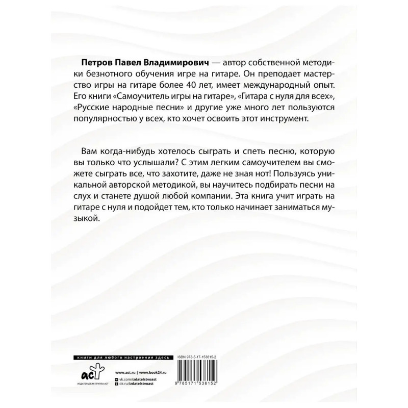 Петров Павел Владимирович автор собственной методики безнотного обучения игре на гитаре. Он преподает мастерство игры на гитаре более 4 лет, имеет международный опыт. Его книги "Самоучитель игры на гитаре", "Гитара с нуля для всех", "Русские народные песни" и другие уже много лет пользуются популярностью у всех, кто хочет освоить этот инструмент. Перед вами понятный самоучитель, который поможет вам стать мастером игры на гитаре, даже если вы раньше никогда не держали ее в руках. Авторская методика позволит вам исполнять любимые песни, не зная нот, с помощью только аккордов. Необходимые азы музыкальной теории изложены в книге так просто, что незаметно для себя вы сможете стать настоящим музыкантом.