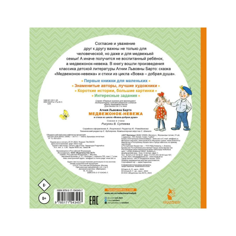 Согласие и уважение друг к другу важны не только для человеческой, но даже и для медвежьей семьи! А иначе получится не воспитанный ребёнок, а медвежонок-невежа. В книгу вошли произведения классика детской литературы Агнии Львовны Барто: сказка Медвежонок-невежа и стихи из цикла Вовка добрая душа.