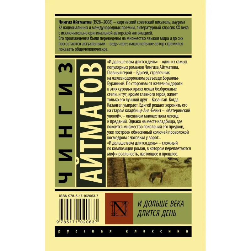 "И дольше века длится день" один из самых популярных романов Чингиза Айтматова. Главный герой Едигей, стрелочник на железнодорожном разъезде Боранлы Буранный. По сторонам от железной дороги в этих суровых краях лежат безбрежные степи, и тут, кроме главного героя, живет только его лучший друг Казангап. Когда Казангап умирает, Едигей решает хоронить его на старом кладбище Ана-Бейит "Материнский упокой", овеянном множеством легенд и преданий. Однако на месте кладбища, где покоится множество поколений его предков, уже построен обнесенный колючей проволокой космодром с часовым у ворот "И дольше века длится день" сложный по композиции роман, в котором переплетаются миф и реальность, настоящее и прошлое.