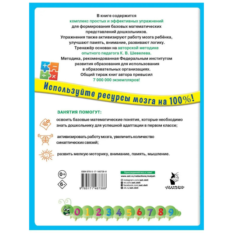 В книге содержится комплекс простых и эффективных упражнений для формирования базовых математических представлений дошкольников. Упражнения также активизируют работу мозга ребёнка, улучшают память, внимание, развивают логику. Тренажёр основан на авторской методике опытного педагога К. В. Шевелева. Методика рекомендованная Федеральным институтом развития образования для использования в образовательных организациях. Общий тираж книг автора превысил 7 экземлпяров! Занятия помогут: освоить базовые математические понятия, которые необходимо знать дошкольнику для успешной адаптации в первом классе; активизировать работу мозга, увеличить количество синаптических связей; развить мелкую моторику, внимание, память, мышление.