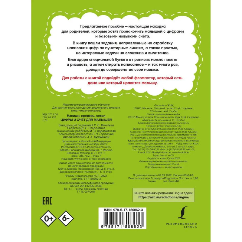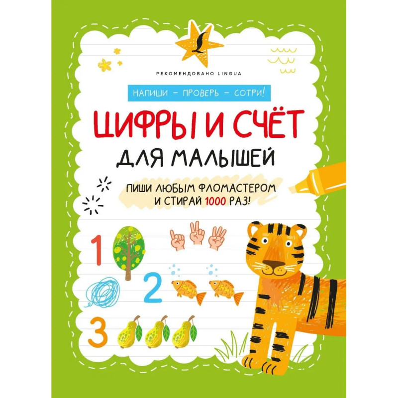 Предлагаемая книга настоящая находка для родителей, которые хотят познакомить малышей с цифрами и базовыми навыками счёта. В книгу вошли задания, направленные на отработку написания цифр по точкам, а также простые, но интересные задачи на сложение и вычитание. Благодаря специальной бумаге в прописях можно писать и рисовать, а затем стирать написанное - и так много раз, доводя до совершенства свои навыки. Для работы с книгой подойдет любой фломастер, который есть дома или который нравится малышу.