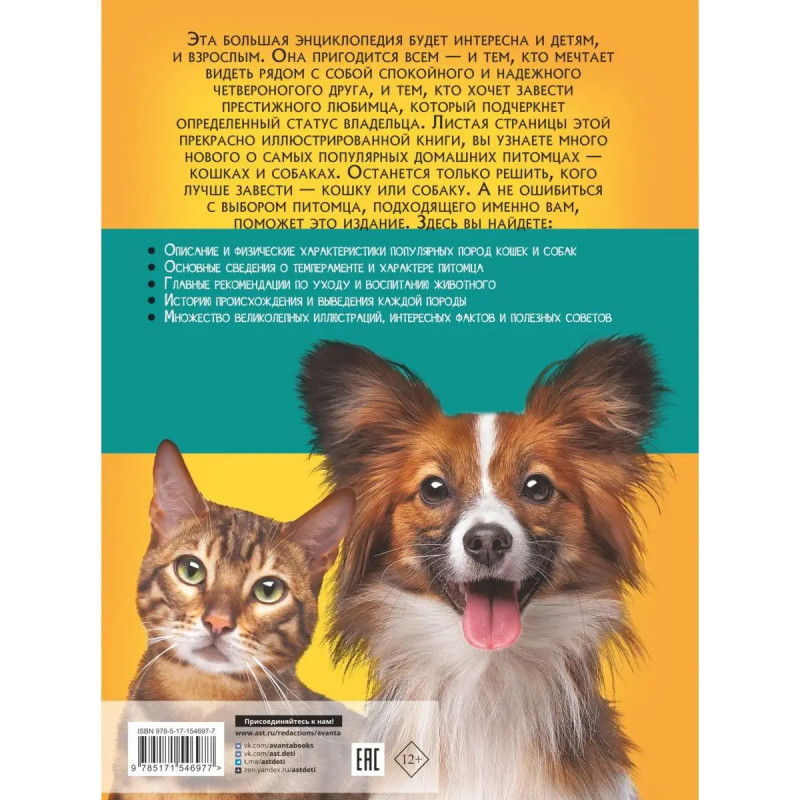 Если вы решили завести домашнего питомца и затрудняетесь с его выбором, вам пригодится эта большая энциклопедия. На страницах книги вы найдете ответ на любой вопрос и узнаете много нового о самых популярных домашних животных кошках и собаках. Какую породу выбрать? Где лучше приобрести будущего питомца? Как за ним ухаживать и заботиться о его здоровье? Какие проблемы могут возникнуть с поведением четвероногого друга и как их преодолеть? Все эти моменты и другие важные ситуации освещены в данной книге. И конечно же, приведены основные породы кошек и собак, описаны история их происхождения и характер, представлены физические характеристики. На страницах энциклопедии даны советы буквально на все случаи жизни, содержится огромное количество важных сведений, интересных фактов и великолепных иллюстраций, так что эта книга будет полезна и детям, и взрослым. Для среднего и старшего школьного возраста.