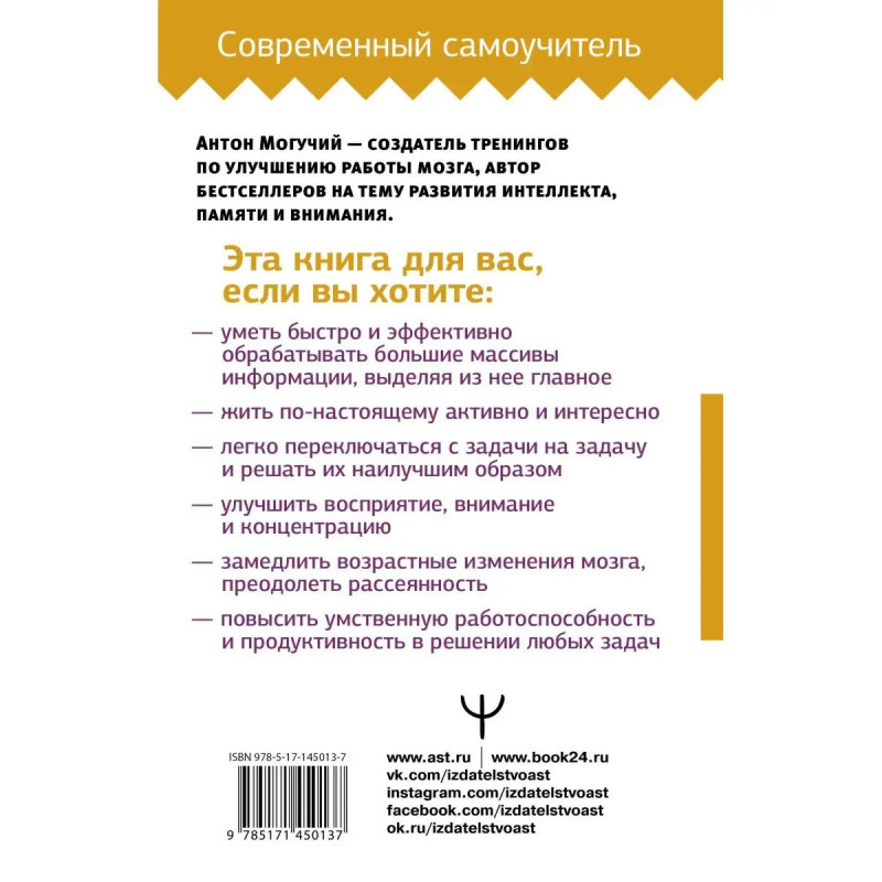 Новая книга Антона Могучего, известного автора тренажеров для повышения эффективности работы мозга, Умный тренажер для мозга. Минимум усилий максимум результата! это авторский тренинг, основанный на методиках Келли и Шульте, для тех, кто хочет повысить свой IQ, научиться лучше концентрироваться на поставленной задаче, получить крепкую память и устойчивое внимание. Тренируясь по 51 минут в день по книге Антона Могучего, выполняя задания тренажера Келли и занимаясь с таблицами Шульте, вы получите возможность прокачать свой мозг, улучшите память и способность к концентрации внимания. Результаты тренировок превзойдут все ваши ожидания!