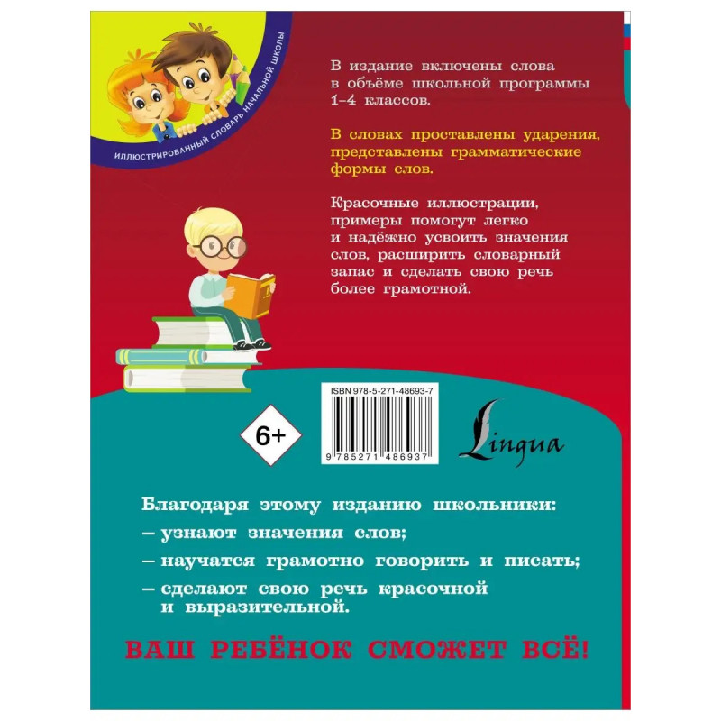 Предлагаемое читателю издание включает в себя три словаря: орфографический, орфоэпический и толковый. Во всех трёх словарях содержится перечень слов в объёме школьной программы 1-4 классов. В орфографическом словаре при каждом слове полностью указаны его грамматические формы, проставлены ударения. В орфоэпическом словаре читатель найдёт список наиболее употребительных слов, в произношении которых учащиеся часто делают ошибки. Во всех словах проставлены ударения, в большинстве случаев приводятся грамматические формы. Толковый словарь содержит слова с их определениями. Красочные иллюстрации, примеры помогут легко и надежно усвоить значения слов, расширить словарный запас и сделать свою речь более выразительной. Издание предназначено для учащихся начальной школы, но также может быть полезно родителям и учителям.