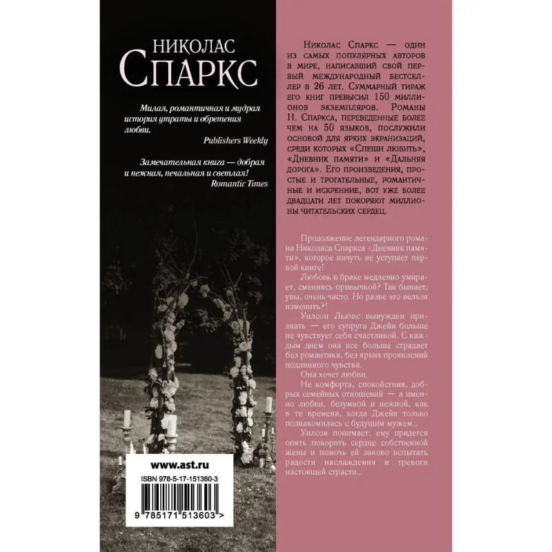 Продолжение легендарного романа Николаса Спаркса "Дневник памяти", которое ничуть не уступает первой книге! Любовь в браке медленно умирает, сменяясь привычкой? Так бывает, увы, очень часто. Но разве это нельзя изменить?! Уилсон Льюис вынужден признать его супруга Джейн больше не чувствует себя счастливой. С каждым днем она все больше страдает без романтики, без ярких проявлений подлинного чувства. Она хочет любви. Не комфорта, спокойствия, добрых семейных отношений, а именно любви, безумной и нежной, как в те времена, когда Джейн только познакомилась с будущим мужем Уилсон понимает: ему придется опять покорить сердце собственной жены и помочь ей заново испытать радости, наслаждения и тревоги настоящей страсти