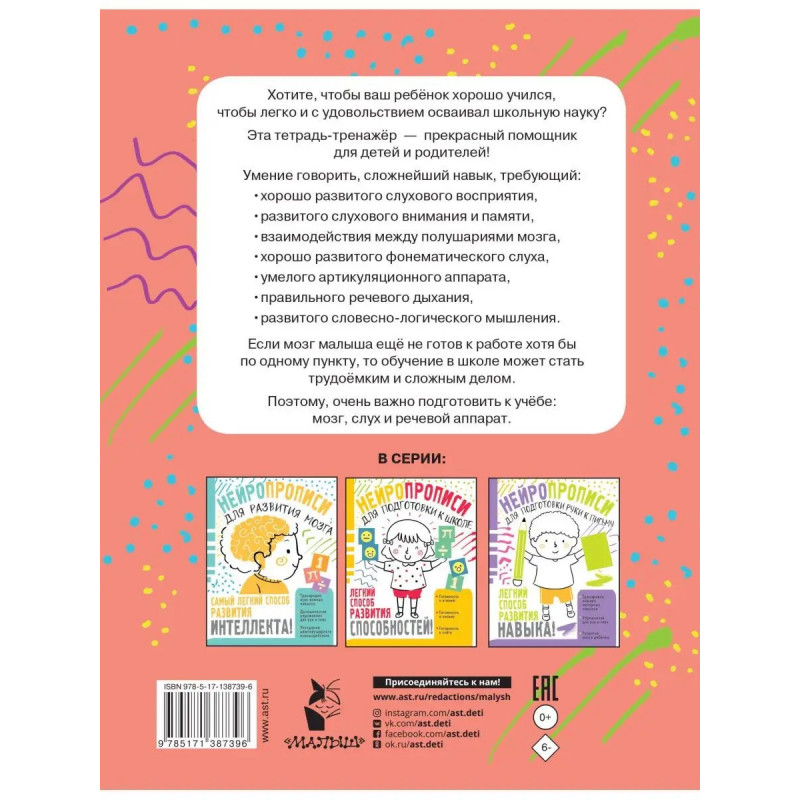 Хотите, чтобы ваш ребёнок хорошо учился, чтобы легко и с удовольствием осваивал школьную науку? Эта тетрадь-тренажёр прекрасный помощник для детей и родителей! Умение говорить, сложнейший навык, требующий: хорошо развитого слухового восприятия, развитого слухового внимания и памяти, взаимодействия между полушариями мозга, хорошо развитого фонематического слуха, умелого артикуляционного аппарата, правильного речевого дыхания, развитого словесно-логического мышления. Если мозг малыша ещё не готов к работе хотя бы по одному пункту, то обучение в школе может стать трудоёмким и сложным делом. Поэтому, очень важно подготовить к учёбе: мозг, слух и речевой аппарат.