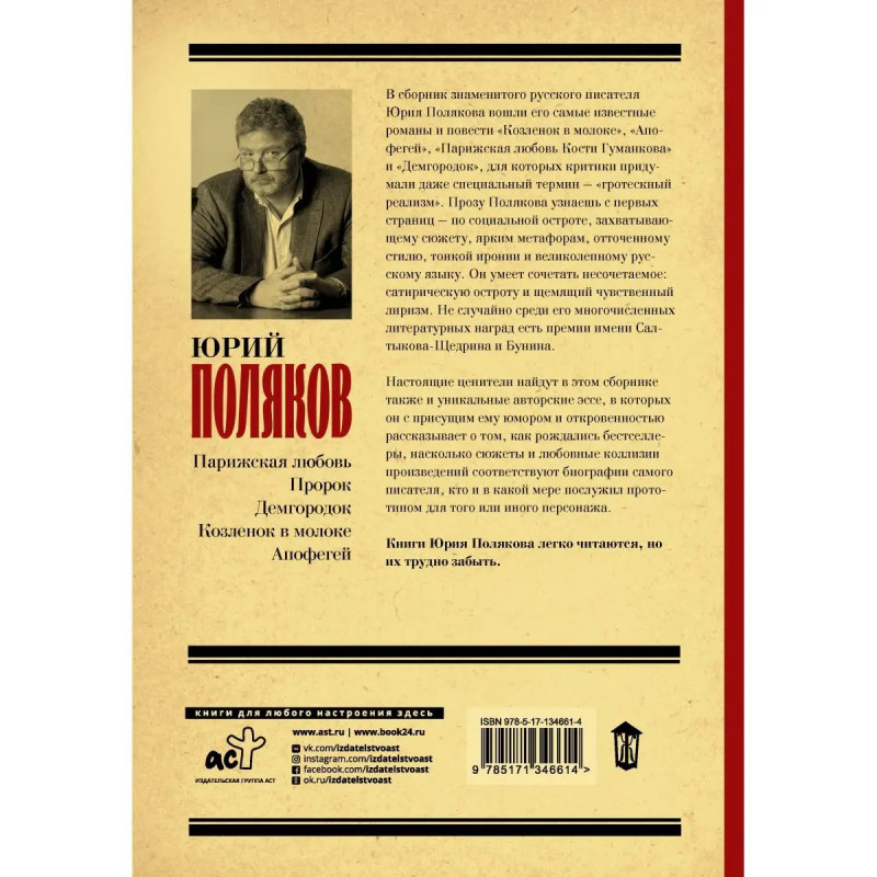 В сборник знаменитого русского писателя Юрия Полякова вошли его самые известные романы и повести "Козленок в молоке", "Апофегей", "Парижская любовь Кости Гуманкова" и "Демгородок", для которых критики придумали даже специальный термин "гротескный реализм". Прозу Полякова узнаешь с первых страниц по социальной остроте, захватывающему сюжету, ярким метафорам, отточенному стилю, тонкой иронии и великолепному русскому языку. Он умеет сочетать несочетаемое: сатирическую остроту и щемящий чувственный лиризм. Не случайно среди его многочисленных литературных наград есть премии имени Салтыкова-Щедрина и Бунина. Настоящие ценители найдут в этом сборнике также и уникальные авторские эссе, в которых он с присущим ему юмором и откровенностью рассказывает о том, как рождались бестселлеры, насколько сюжеты и любовные коллизии произведений соответствуют биографии самого писателя, кто и в какой мере послужил прототипом для того или иного персонажа. Книги Юрия Полякова легко читаются, но их трудно забыть.