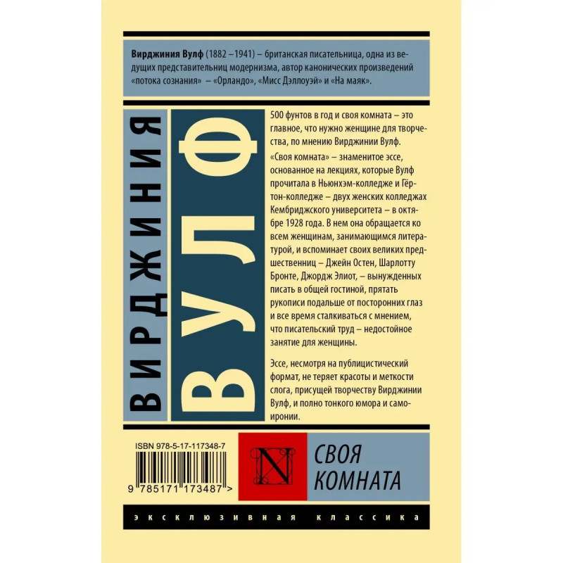 5 фунтов в год и своя комната это главное, что нужно женщине для творчества, по мнению Вирджинии Вулф. "Своя комната" знаменитое эссе, основанное на лекциях, которые Вулф прочитала в Ньюнхэм-колледже и Гёртон-колледже двух женских колледжах Кембриджского университета в октябре 1928 года. В нем она обращается ко всем женщинам, занимающимся литературой, и вспоминает своих великих предшественниц Джейн Остен, Шарлотту Бронте, Джордж Элиот, вынужденных писать в общей гостиной, прятать рукописи подальше от посторонних глаз и все время сталкиваться с мнением, что писательский труд недостойное занятие для женщины. Эссе, несмотря на публицистический формат, не теряет красоты и меткости слога, присущей творчеству Вирджинии Вулф, и полно тонкого юмора и самоиронии.