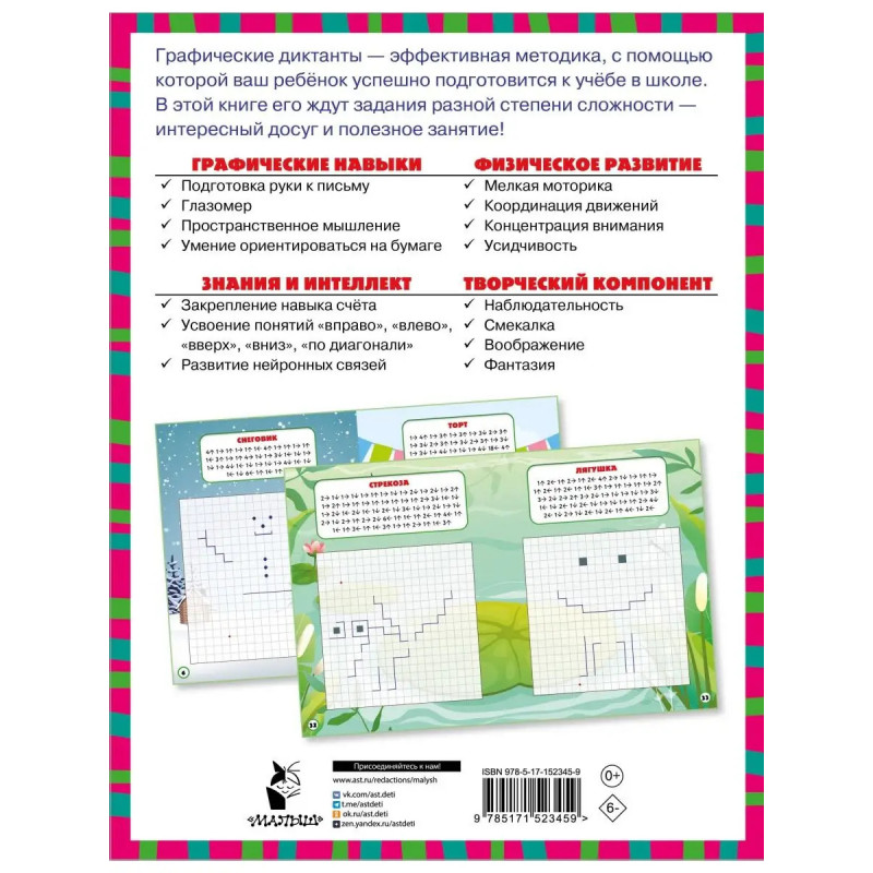 Графические диктанты эффективная методика, с помощью которой ваш ребёнок успешно подготовится к учёбе в школе. В этой книге его ждут задания разной степени сложности интересный досуг и полезное занятие! Идеально для занятий с детьми 4-7 лет. Развиваем графические навыки: подготовка руки к письму, глазомер, пространственное мышление, умение ориентироваться на бумаге. Физическое развитие: мелкая моторика, координация движений, концентрация внимания, усидчивость. Знания и интеллект: закрепление навыка счёта; усвоение понятий вправо, влево, вверх, вниз, по диагонали; развитие нейронных связей. Творческий компонент: наблюдательность, смекалка, воображение, фантазия. Как заниматься по книге? Найдите стартовую точку. Количество клеток обозначено числом, а направление стрелками. Начните проводить линию последовательно, стараясь не отрывать руку от бумаги. Советы родителям: Перед занятием поиграйте в игру Солдат. Вы отдаёте приказ, а малыш его выполняет. Например: Повернись налево